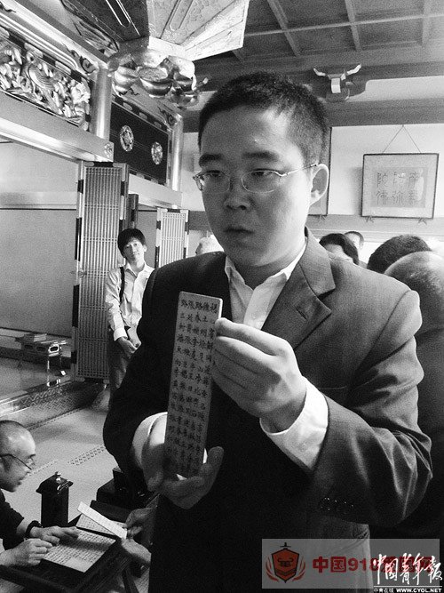 2013年7月2日,在东京枣寺,二战强掳中国劳工第四代遗属骆勐找到了外曾祖父的名牌。 |