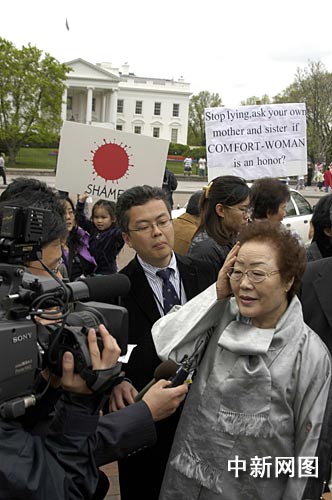 中新网华盛顿4月26日 ( 记者 邱江波)身穿高丽民族盛装,悲惨讲述自十五岁起遭受日本军队蹂躏,韩国前慰安妇李容洙老人今天来到美国白宫前,和众多民间人士一起抗议日本首相安倍晋三访问美国。