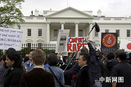 安倍就任以来首次出访美国,就遭到亚裔民间团体和一些国际组织人士的示威抗议。记者今天上午来到白宫前面的拉菲耶特广场在现场看到,今天来到白宫北门的示威者约有五白人,多数是亚裔美国人,其中韩裔和华裔居多。示威者举行了演讲,宣读了声明,韩裔前慰安妇李容洙老人还声泪俱下控诉了日本军队的暴行,随后他们在白宫围墙外面举行了象征性的行走。一位名叫安迪?林的华裔女士带着她仅有四岁的小女儿玛丽从新泽西州赶来,母女俩手举一个画有流着鲜血的太阳标志纸板,上面写着:Shame(羞耻)。